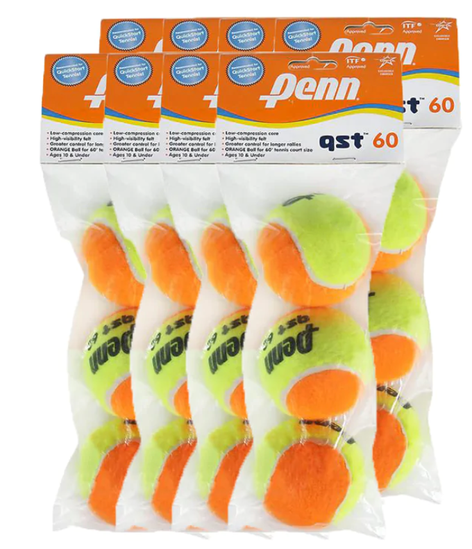 Ideal for advanced beginning players ages 9 and 10 playing on a 60’ tennis court, the QST 60 features a low compression core allowing greater conrol for longer rallies. With high visibility orange and yellow felt, the Penn QST 60 is also enjoyable for adults who require a slower playing tennis ball.