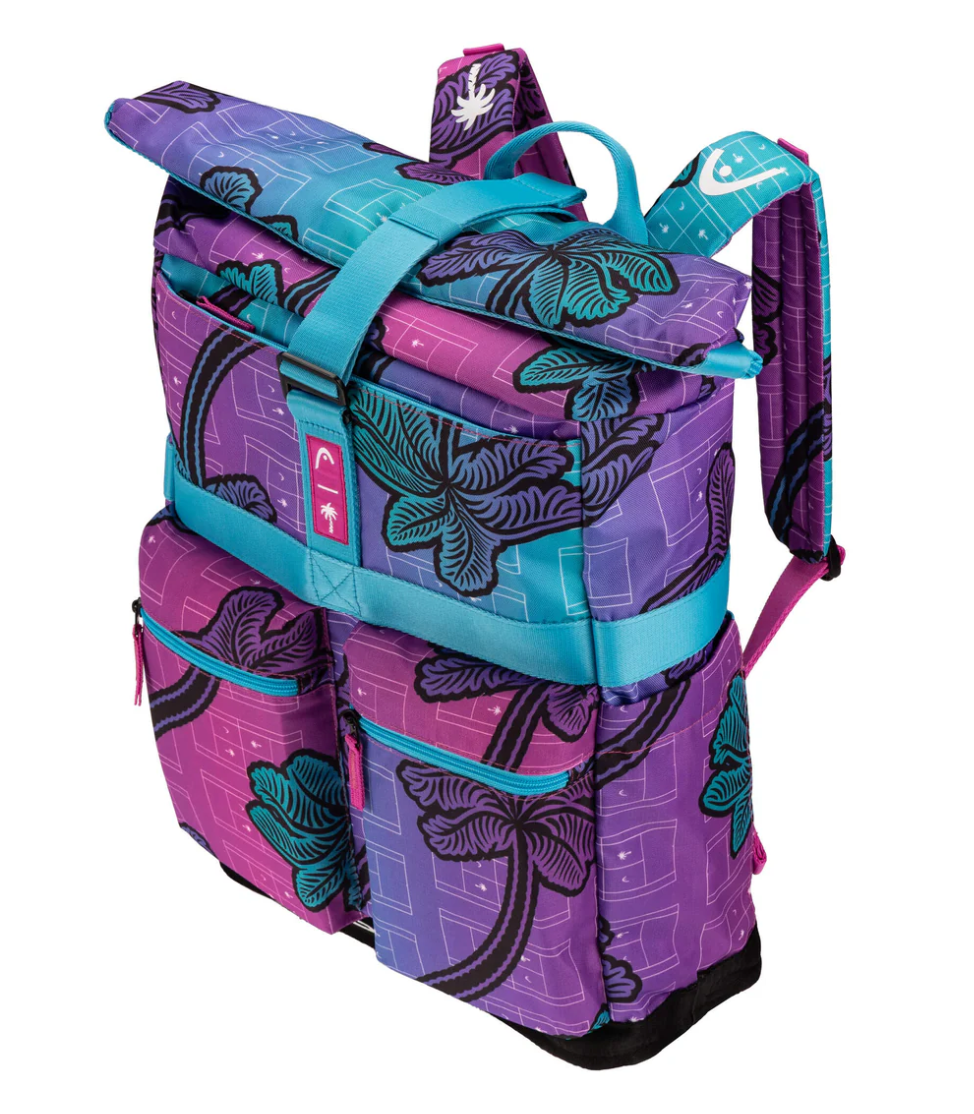 The Palm Tree Crew’s tropical vibes and carefree spirit are blended with HEAD’s sporty expertise in the TOUR BACKPACK 30L PTC EDITION. Part of a limited-edition collection created from a collaboration between HEAD and the Palm Tree Crew, this bag has a palm tree pattern in the vibrant colors of DJ Kygo’s lifestyle brand. Fun, youthful and dynamic, this collection – which also includes limited-edition racquets – is redefining sports culture. Perfect for the courts or the city, this versatile backpack has a stylish and functional roll-top. It is easy to organize your belongings in a bag that has a main compartment and racquet compartment as well as two front zipped accessory pockets and two inside accessory pockets. As an illustration of how HEAD is trying to reduce plastic usage, the hangtag is made from recycled paper and tied with hemp cord, and the bag is presented in a recycled plastic bag.